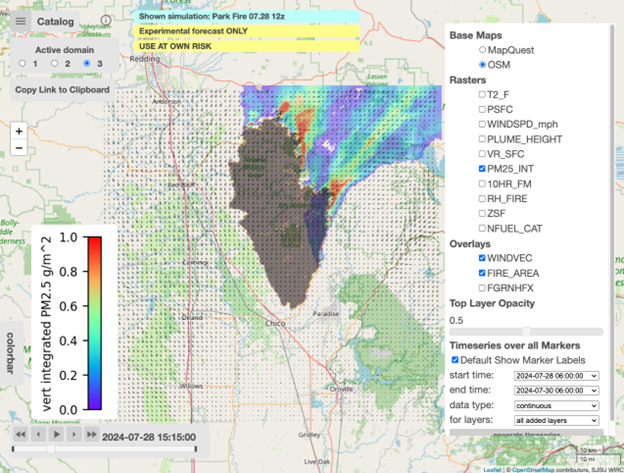 We feed supercomputers with weather data, satellite fire observations, airborne infrared fire perimeters, and fuel moisture to forecast future fire risk, fire progression, and smoke dispersion. We are a part of the Open Wildfire Modeling Group, gathering together developers of open-source wildfire models to help solve local and global wildfire problems.